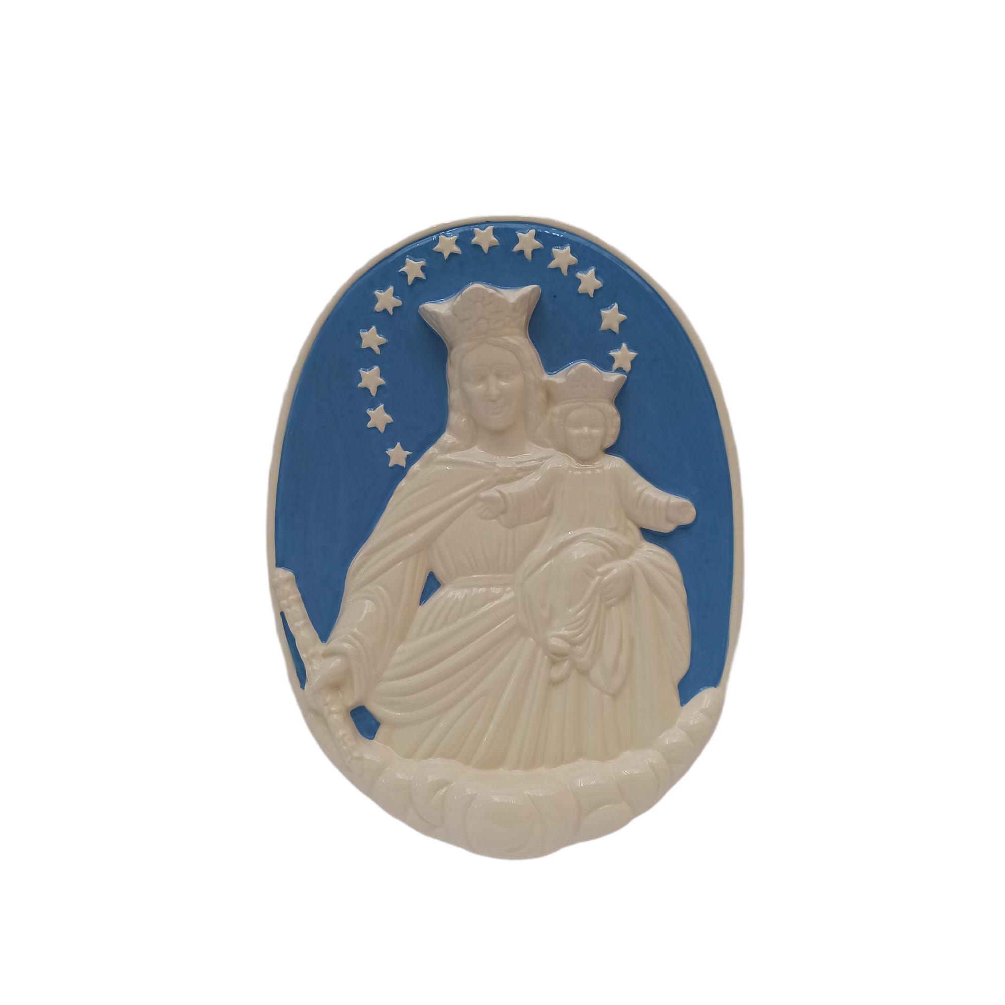 Bassorilievo in ceramica in stile Della Robbia (cm) L.23,5 – H.31 – P.5 Madonna Ausiliatrice.